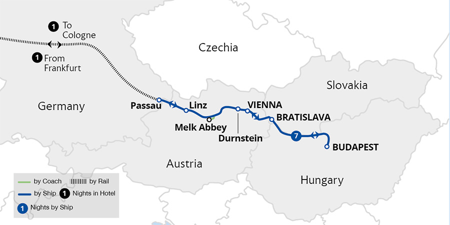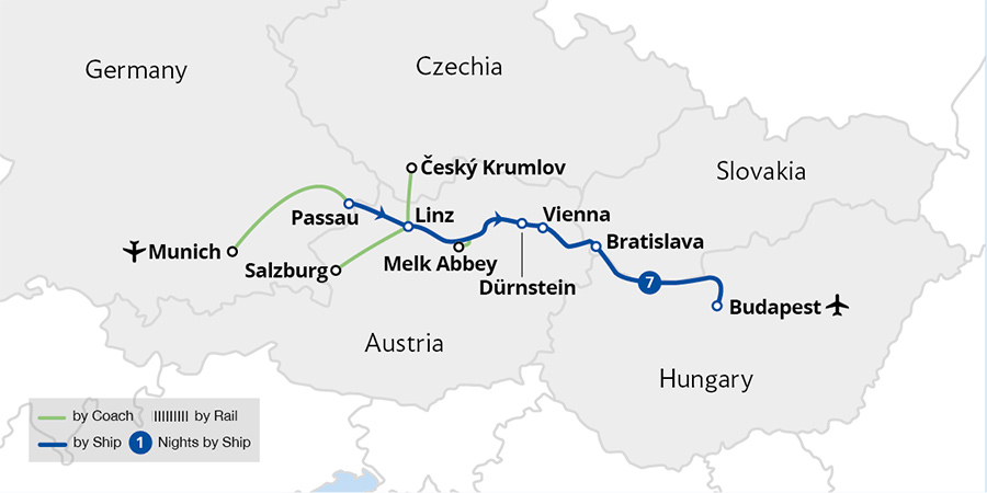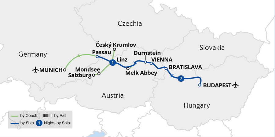 Fly to Budapest, the 'Pearl of the Danube' for a luxurious cruise through beautiful nature and the historic cities of central Europe. Enroute, uncover quaint villages, hillside vineyards and local cuisine. After exploring the fascinating cities of Bratislava and Vienna, marvel at the 11th-century Melk Abbey in Austria's scenic Wachau Valley.