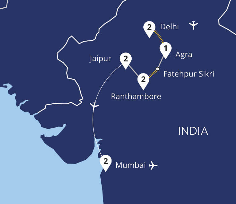 Discover enthralling India on a journey from the enchanting Golden Triangle to the 'Gateway to India', Mumbai. View the Delhi's imposing Red Fort, Agra's iconic Taj Mahal and Jaipur's ethereal Amber Fort on a tour of northern India's most incredible palaces. Look for noble Bengal tigers in their natural habitat on two game drives in the pristine...