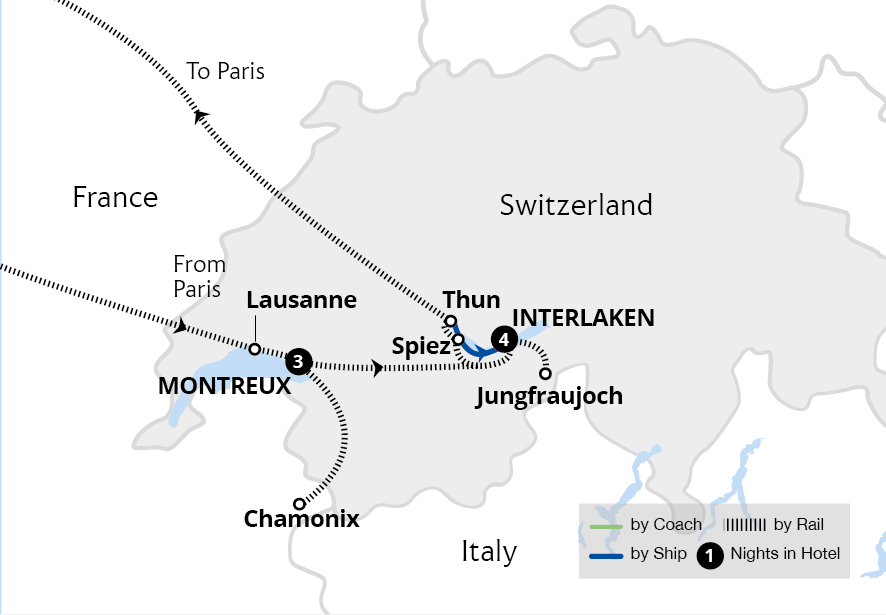 On this sensational holiday, travel from Montreux on the shores of Lake Geneva to the mountainous surroundings of the Jungfrau Massif. Explore Château de Chillon, sail on Lake Geneva and cross the Alps to the French mountain town of Chamonix on the Mont Blanc Express. Boarding the GoldenPass Express, admire views of the Bernese Alps...